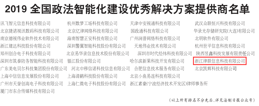 6月1日至9日,《法制日報》官方微信公眾號開展了為期9天的投票,6月10日,法制日報社舉行專家評審會,律聯(lián)科技的“e律師智慧律所應(yīng)用系統(tǒng)”項目在本次活動當(dāng)選“2019全國政法智能化建設(shè)優(yōu)秀解決方案提供商”。