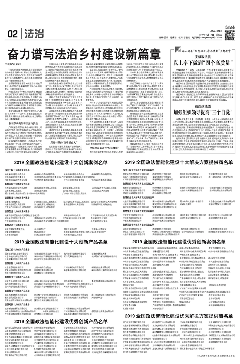 為深化政法智能化建設(shè),推動社會治理現(xiàn)代化,開創(chuàng)平安中國新境界,對新的科技應(yīng)用和成熟方案進行成果展示,進一步調(diào)動科研單位、企業(yè)參與政法智能化建設(shè)的積極性,提供更好的方案和科技支撐,為政法單位、科技企業(yè)搭建一個經(jīng)驗交流、技術(shù)對接平臺,由法制日報社舉辦了“2019全國政法智能化建設(shè)創(chuàng)新案例征集活動”,活動共征集政法單位創(chuàng)新案例222個,企事業(yè)單位解決方案189個、創(chuàng)新產(chǎn)品151個。