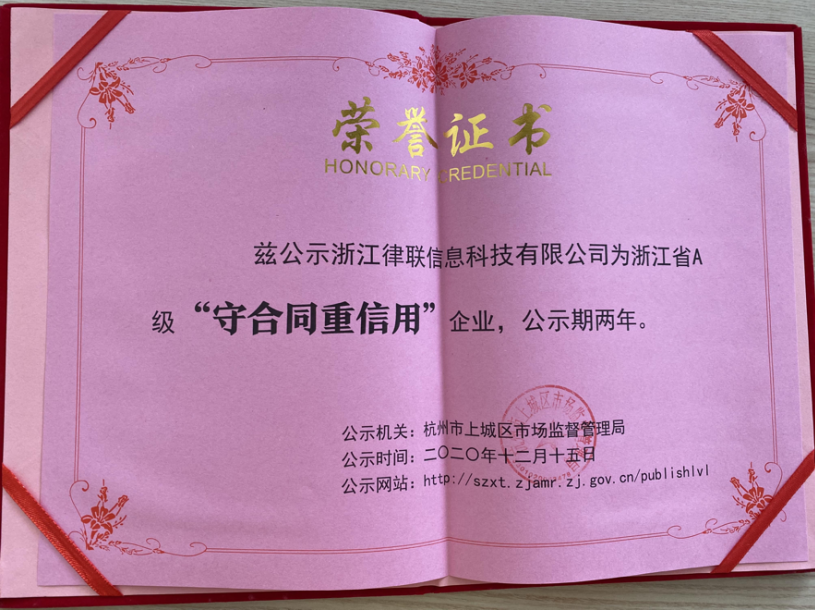 2020年12月,浙江律聯信息科技有限公司憑借多年的誠信經營和規(guī)范管理,通過杭州市市場監(jiān)督管理局的嚴格評審,榮獲浙江省A級“守合同重信用企業(yè)”的稱號。